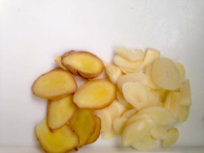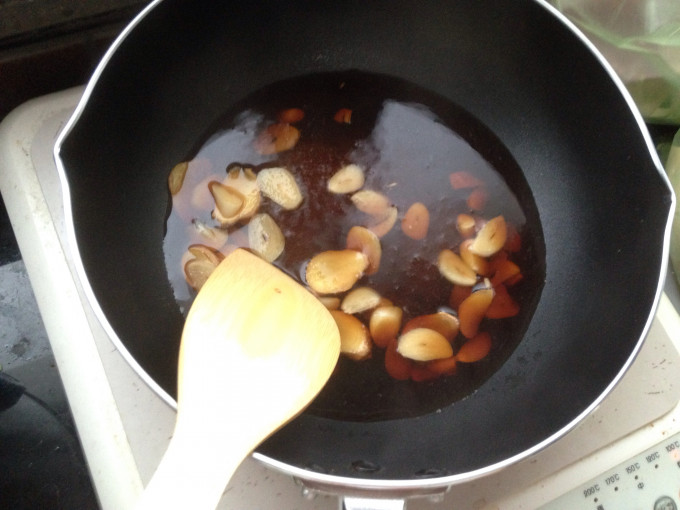將醬汁放入鍋中加熱,加入蒜片及薑片,滾了就放入食材。