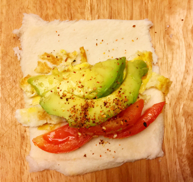 吐司麵包抹上甜辣醬,鋪上酪梨、蛋皮、蕃茄捲起,就是簡單的小點心。