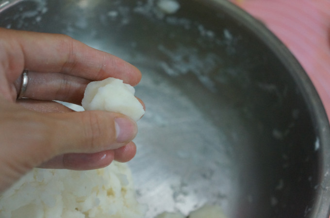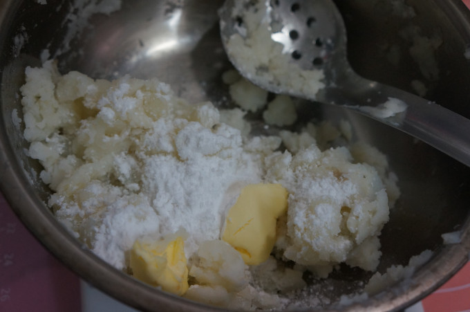 馬鈴薯切塊用電鍋蒸熟,趁熱將馬鈴薯用叉子壓成泥, 薯泥+奶油+太白粉用手混合攪拌為成團的麵團