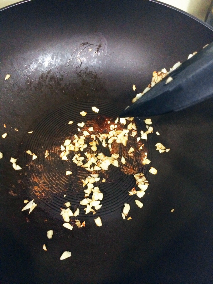 將蒜末倒入鍋內,利用剛剛牛排本身的油脂,把蒜末炒出微微的焦酥,切記不要太焦,以免口感偏苦
