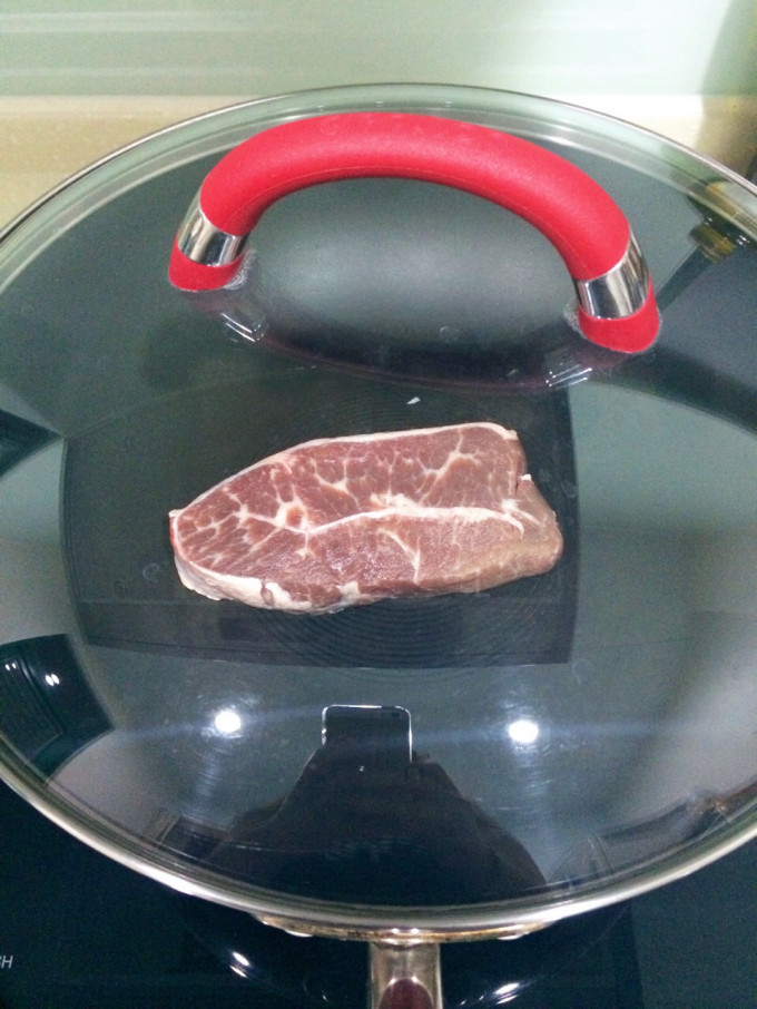 不沾鍋的平底鍋,使用中火稍微預熱後,不需放油,直接放入牛肉塊再蓋上蓋子悶煎2分鐘