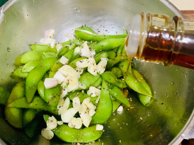 放入鹽巴、黑胡椒粒跟香油 愛吃辣可以加辣椒拌一拌 或放入保鮮盒搖勻