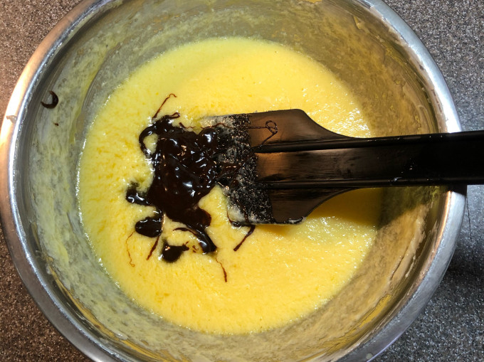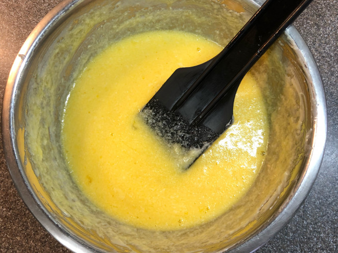 將室溫雞蛋一次一顆打入乳化奶油裡攪拌至完全融合。