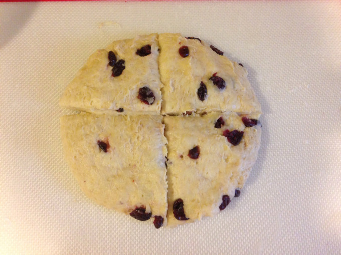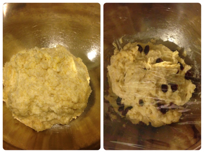 酵母、砂糖和鹽放入麵粉中(酵母與鹽不能重疊放在一起),略為攪拌一下,再將步驟1的酸奶油液加入至麵粉中,攪拌均勻,再加依喜好加入蔓越莓乾拌勻,用保鮮膜封住鋼盆,先在室溫中靜置發酵30分鐘,再放入冰箱冷藏發酵8小時以上