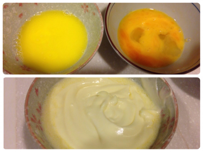 牛奶+奶油微波加熱融化,雞蛋打散,再全部和酸奶油攪拌均勻,備用