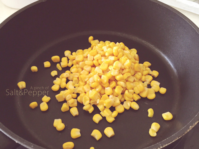 先乾鍋預炒玉米粒,可以減少罐頭的密封味道,然後起鍋備用。