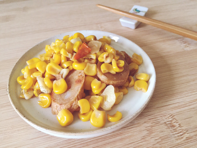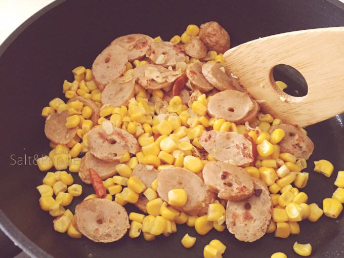 最後加入「玉米粒+胡椒+塩」拌炒均勻即可。