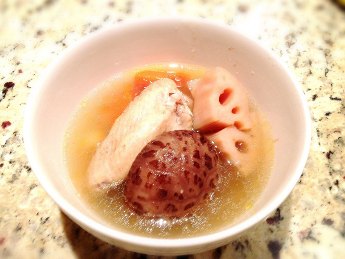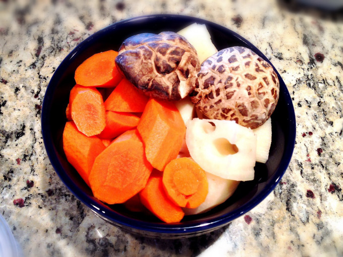 燒一鍋滾水,放1-2片薑片,水滾後,把雞腿、雞翅全放進去川燙,然後用冷水洗乾淨。在川燙雞腿、雞翅的同時,把紅蘿蔔、蓮藕削皮切塊,花菇洗乾淨。