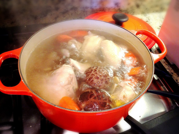 取一大鍋 (這次用的是 LC 26“ 深湯鍋),燒滾水,放入剩餘的薑片。水滾開後,把所有材料放進去,大火滾開約 5分鐘。
