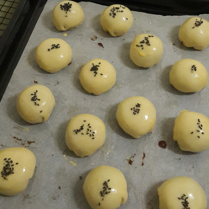 把蛋黃液(生蛋黃+牛奶打散)塗抹在擺在烤盤上的蛋黃酥上。第一層要把整顆都塗到,第二層塗完後要趁蛋液還沒乾時灑上一些黑芝麻在蛋黃酥正中央。