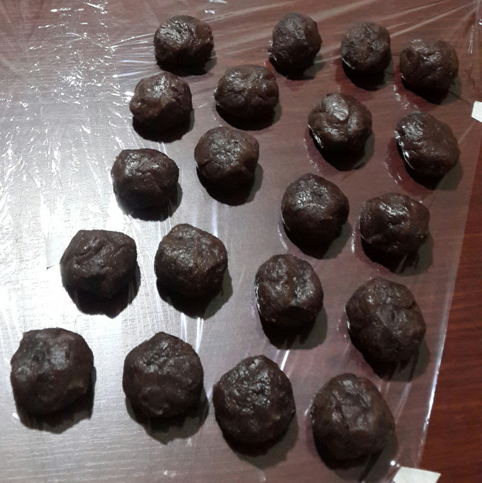 將蛋黃包入紅豆沙中,搓圓後把蛋黃的上方那面朝下擺放。