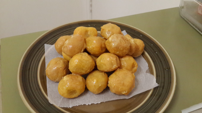 把油酥和油皮各平均分成30份。注意分好後要用塑膠袋或保鮮膜先蓋著,否則會乾掉。接著把油酥分別包入油皮中,像包包子那樣包入正中央。全部包好成小麵團球狀後放著備用。(一樣用塑膠袋或保鮮膜先蓋著)