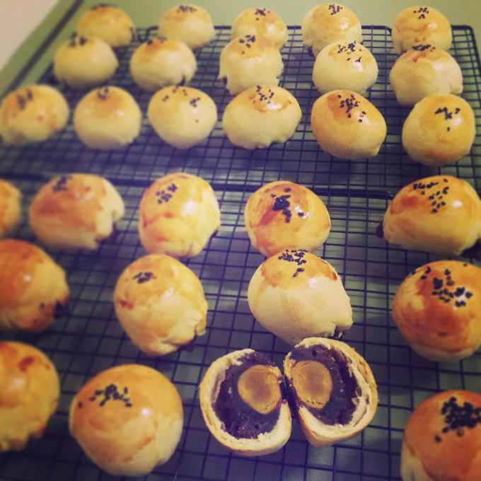 烤箱轉至180度,開始預熱。把麵團卷平放在檯面(不是與桌面垂直),桿成員形的麵皮,要比水餃皮大,而且四周要薄一些。把已經包入蛋黃的豆沙餡包入麵皮中。捏緊,並把表面及側邊搓圓。一個一個放在烤盤上,彼此留些距離,用塑膠袋或保鮮膜先蓋著以防乾掉。