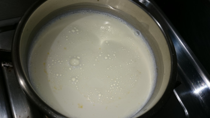 將鮮奶倒入小鍋內,開極小火加熱倒入糖攪拌溶化,再倒入步驟1的吉利丁粉續攪拌到粉末融合無顆粒,再倒入鮮奶油攪拌均勻,熄火~完成奶酪液。