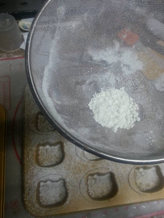 麵粉過篩後,分三次以刮刀切拌的方式拌人打發的蛋糊裡,至看不見乾粉。