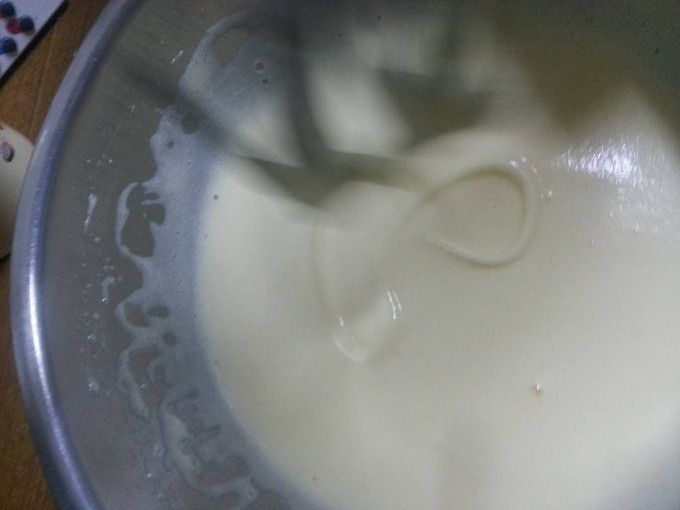 將細砂糖加入微溫的蛋液裡高速打發至打蛋器提起有明顯折疊痕跡。