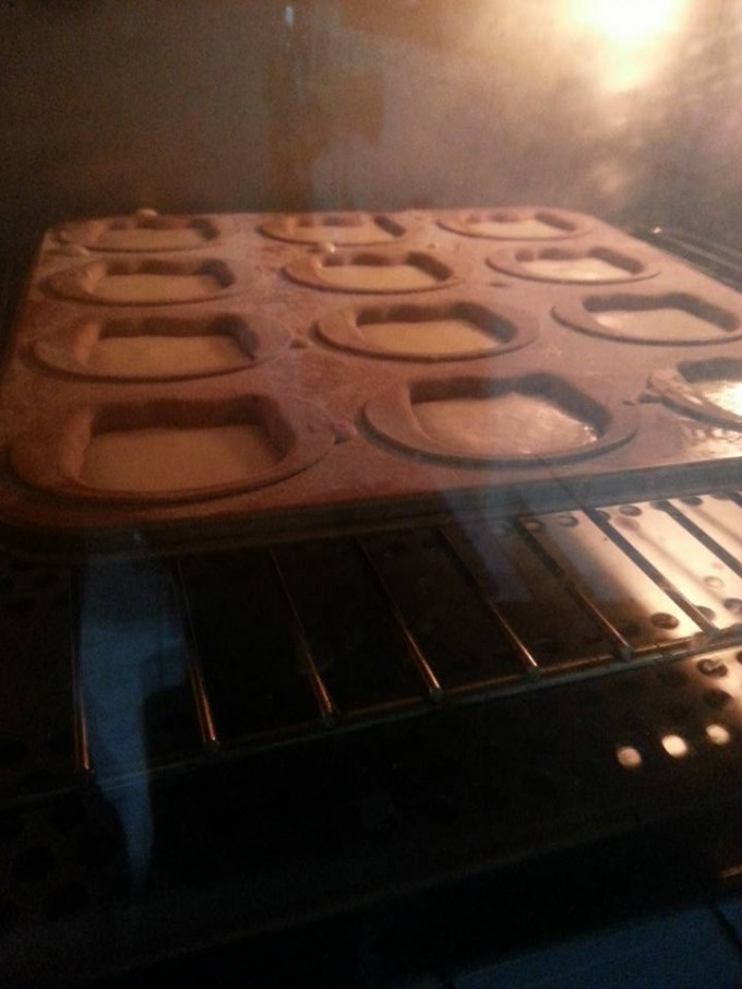 烤模:倒入9分滿的蛋糕糊,入烤箱中層以180度烤10分鐘到表面上色就取出脫模,這配方的份量會剩一點點蛋糕糊剛好可以用鬆餅機烤兩片鬆餅,硬要全部倒進烤模,會烤到溢出來(照片中的小魚就是這樣啊...)。