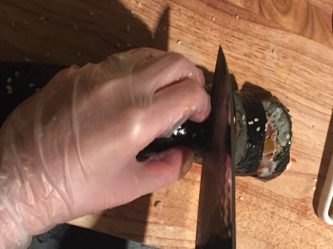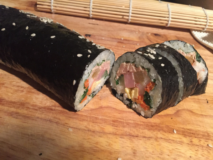 最後灑點白芝麻做裝飾,將紫菜包飯切成多份就可以享用了! 做很多想留到明天給小孩或自己帶到學校或上班當午餐的朋友們可以試試用鋁箔包將切好的紫菜包飯包起,午餐想享用時很方便!