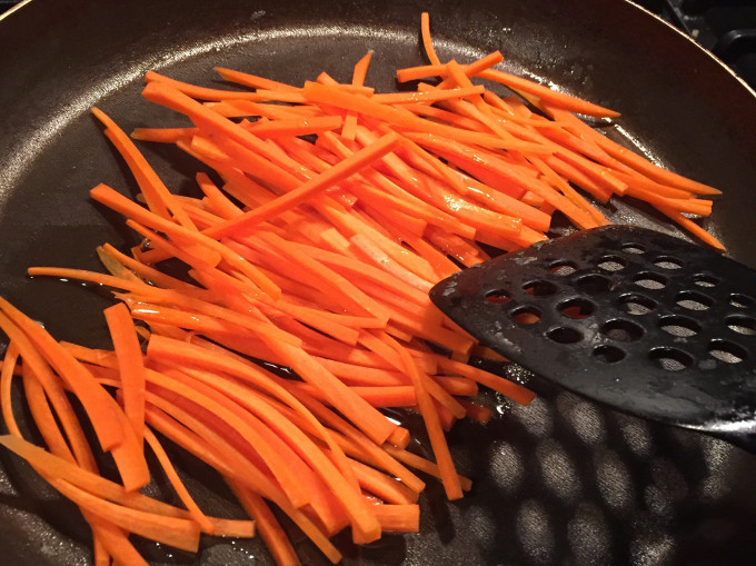 使用平底鍋炒紅蘿蔔絲,加少許鹽,紅蘿蔔有點熟是可拿起放一旁備用。完後用同一個平底鍋煎剛切好的火腿,熟後拿起放一旁備用