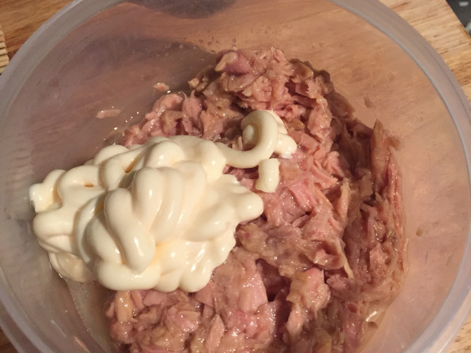 清洗芝麻葉,同時準備3罐鮪魚,將汁倒掉,加入3~4大匙美乃滋攪拌均勻。 如有喜歡辣味的朋友可加韓式辣椒醬少許