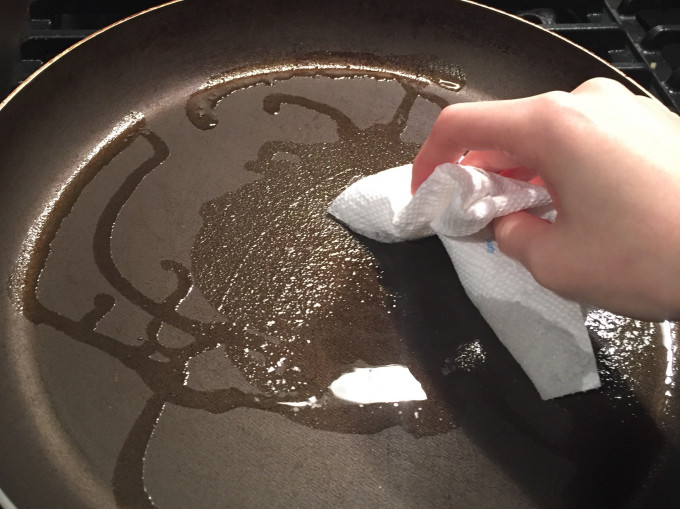 打兩到三顆蛋,熱平底鍋,加入一大匙油,鍋熱了之後用餐巾把油抹均勻 (這樣煎出來的蛋顏色會比較好看)