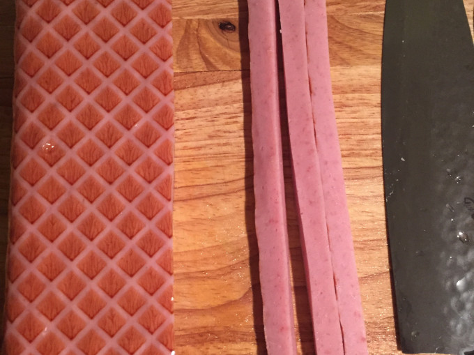 將火腿和蟹肉條也切成條形,大概切10到12條即可 (買不到紫菜包飯專門用的火腿可以用午餐肉SPAM/LUNCHEON MEAT代替)