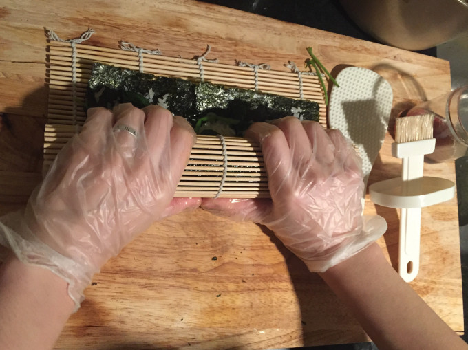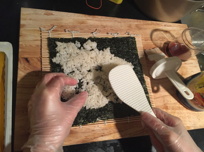 倒一點麻油在一個容器裡 用刷子沾麻油塗在壽司海苔的亮面。吐完後亮面朝下,準備可以開始放料了!