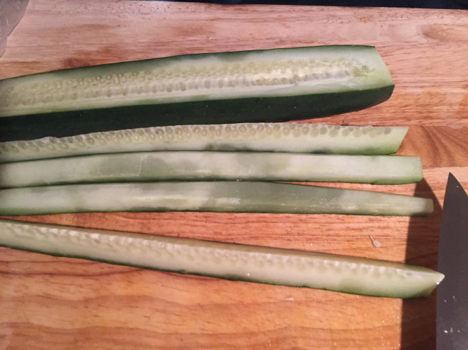 小黃瓜切半後將一半分成4條,之後去籽 (不喜歡小黃瓜的人可以再切跟小這樣吃的時後味道不會那麼重)