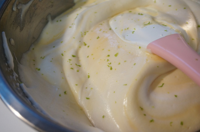 再將步驟10倒入剩下的蛋白霜中,刨入適量的檸檬皮屑後輕輕拌勻。 (此時烤箱可以先預熱170度)