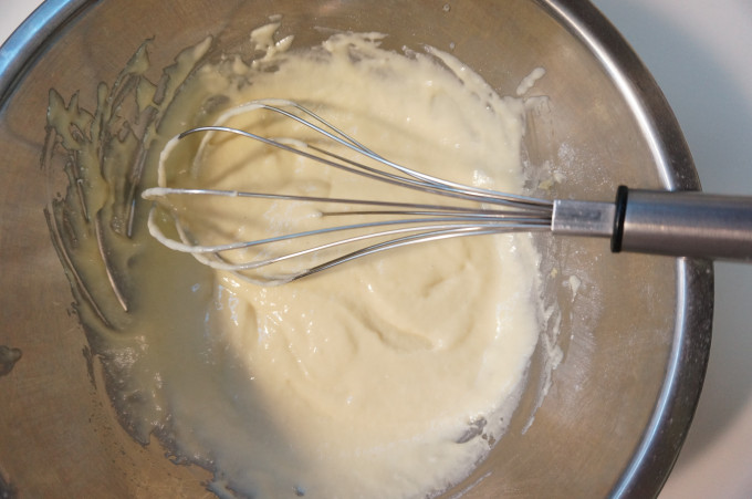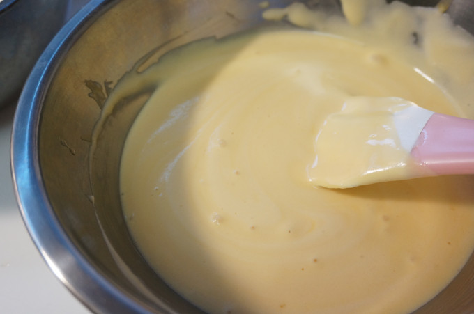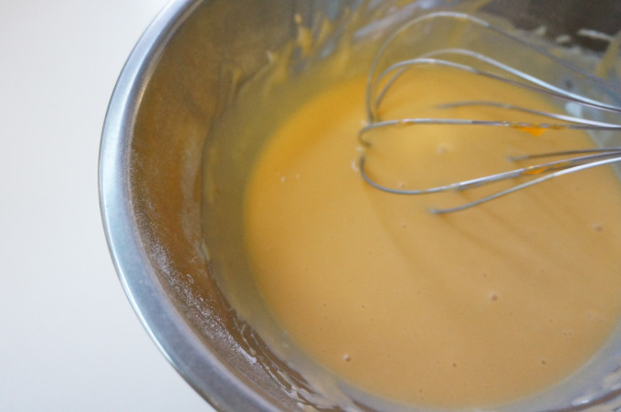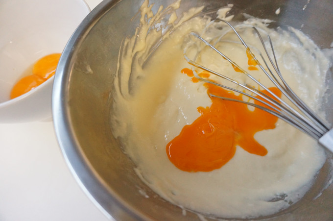 再將蛋黃一個一個加入。一個加入拌均勻後再加另一個。