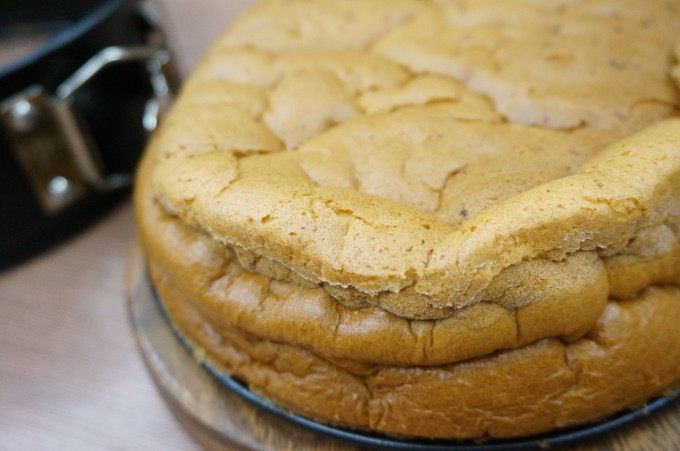 將拌好的蛋糕糊倒入,輕敲底部讓多餘的空氣排出。