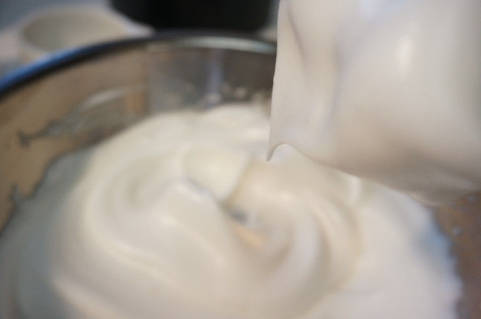 再繼續攪打至蛋白霜沾起呈倒鉤狀不滴落即可。