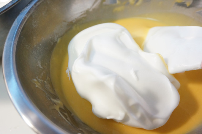 取1/3的蛋白霜放入奶油蛋黃糊中。