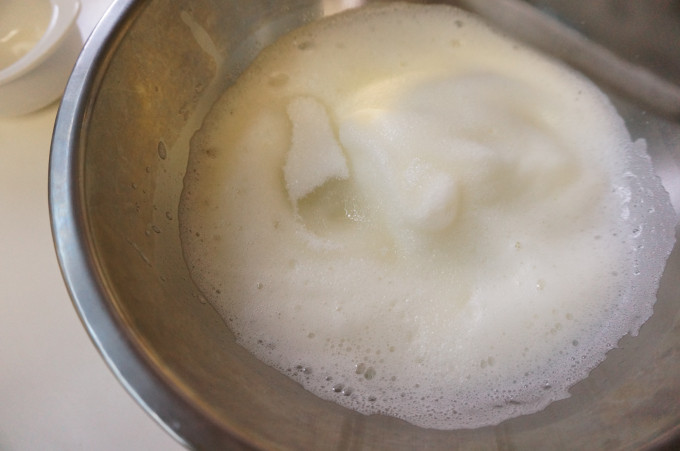 另準備一個鋼盆將蛋白放入,用電動攪拌器打到起粗泡泡時加入糖和檸檬汁。