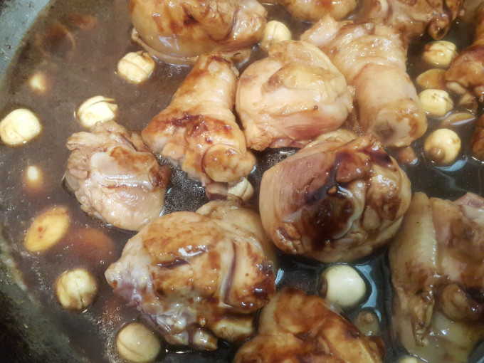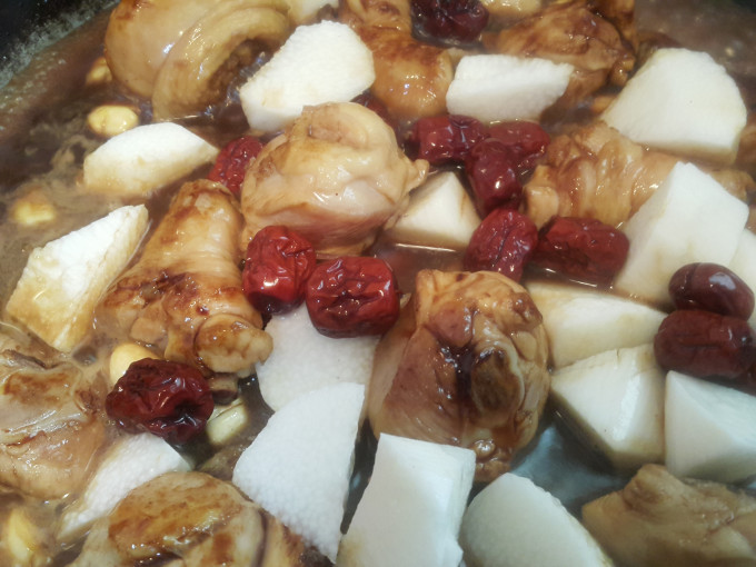 依序加入山藥及紅棗煮滾後轉小火蓋上鍋蓋縮汁