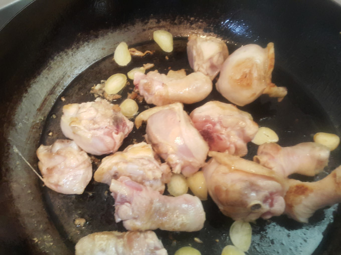 鍋中倒入少許油再將雞腿肉倒入先煎至表面金黃倒入蒜片一起煸香
