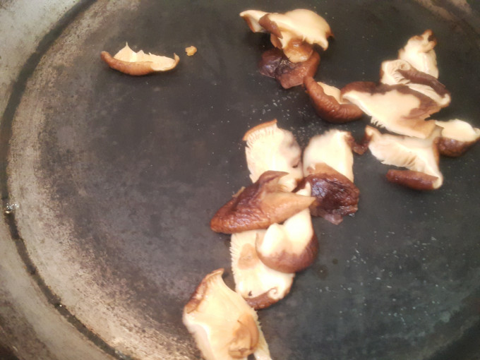 加入2大匙蠔油及蓮子炒香後,倒入泡香菇的香菇水