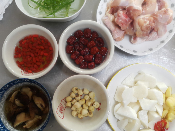香菇泡軟切片,山藥切滾刀塊 雞腿肉切成適合大小 蒜頭,辣椒切片 其他食材洗淨備用