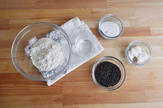 製作湯圓皮:另取一個料理盆,加入糯米粉,再倒入水攪拌,這個時候若麵粉無法全都沾到水沒關係,只要取成團的粉糰一小塊,儘量捏成圓扁形拿去煮,水滾下鍋煮到它浮起來,粿粹、粄娘(媽) 就做好了,再用這塊粄粮去沾盆內的乾粉,並與之前的粉糰充份揉在一起,直到看不到粄娘為止,這過程要有點耐心。