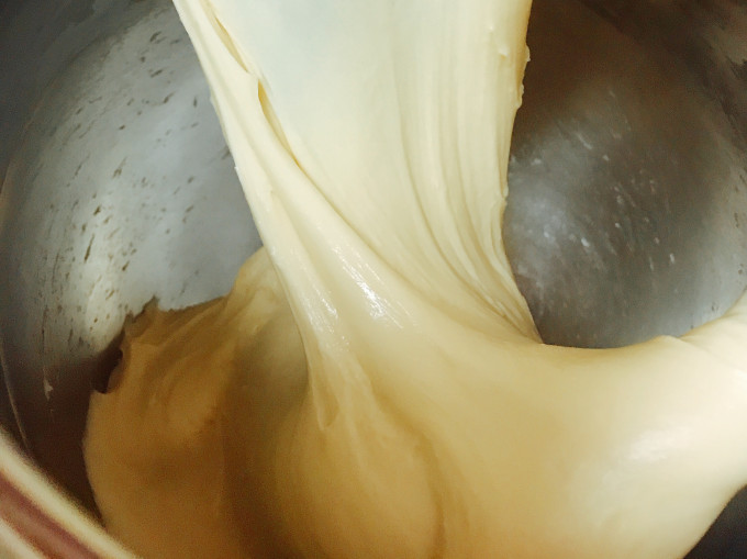 所有材料(除了奶油)用麵包機或攪拌機揉至成團,稍微拉扯不易斷,加入無鹽奶油揉至奶油完全被麵團吃進去,表面光滑,放室溫(27度以上)發酵至1.5-2倍大,約60分鐘