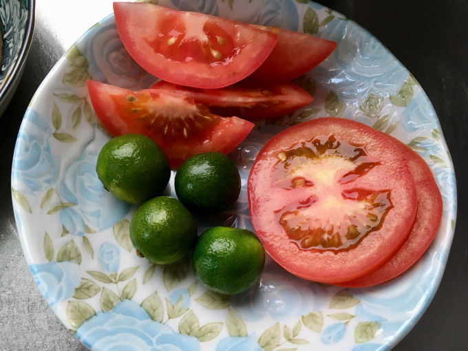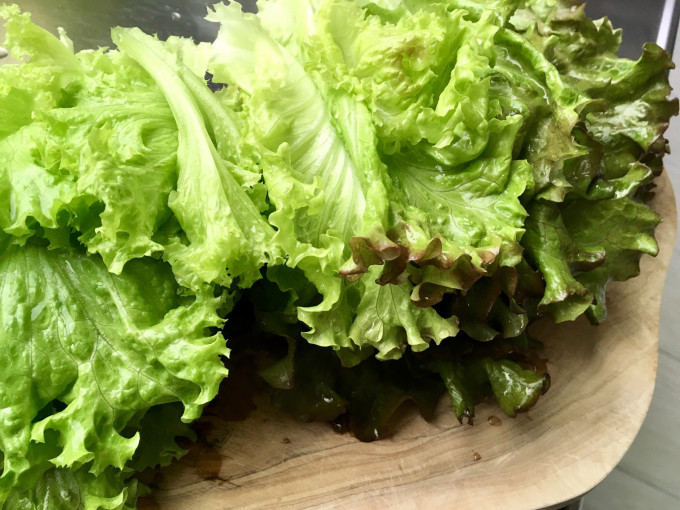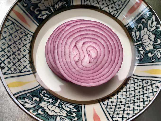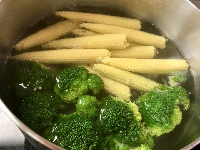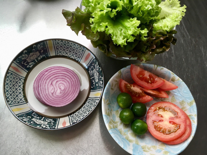 來擺晚餐的.先鋪生菜.紫洋蔥.蕃茄.玉米筍跟綠花椰