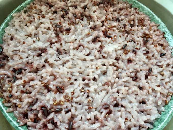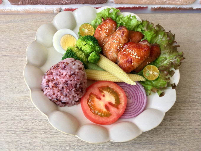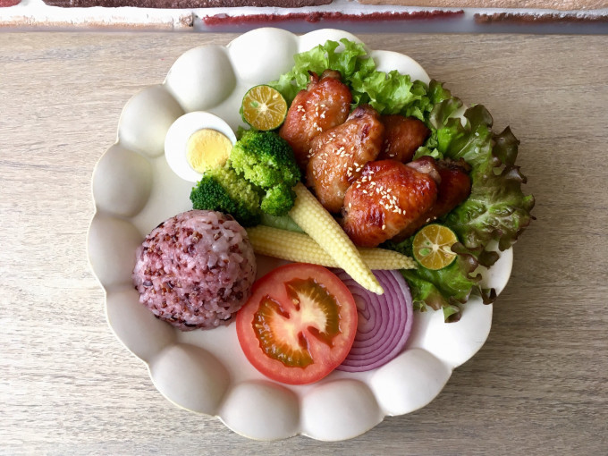 水煮蛋切半.裝一點紫米紅藜麥飯(這次用茶杯當模).鹹甜鹹甜的照燒雞.享用囉~