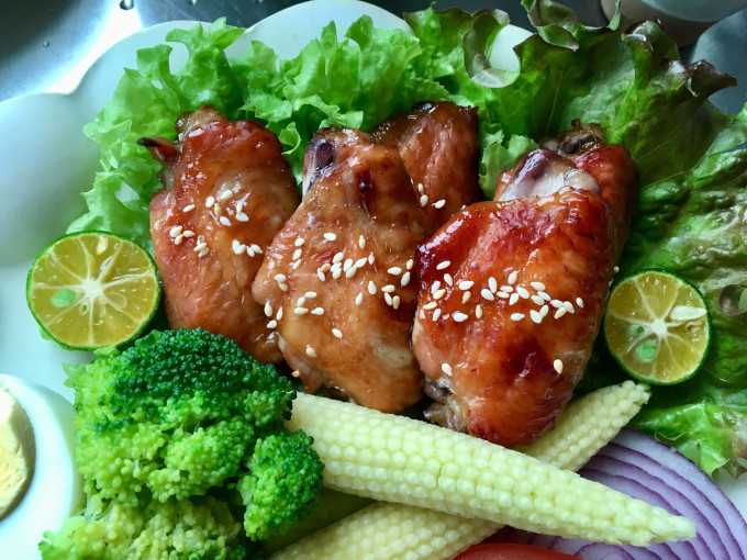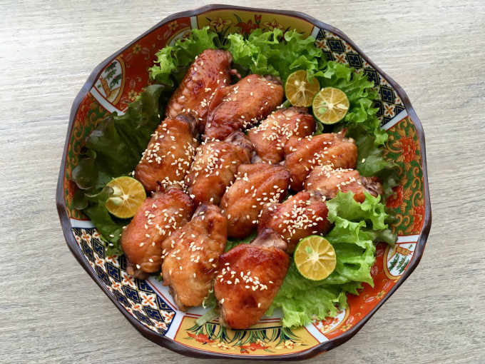 雞翅排好.撒芝麻.擱上金桔.照燒雞翅.完成(這盤是挑出來拍照跟吃不夠可以續肉的)