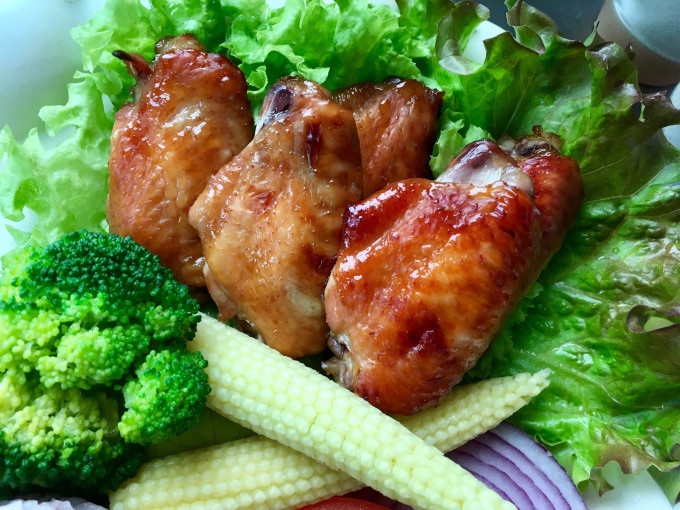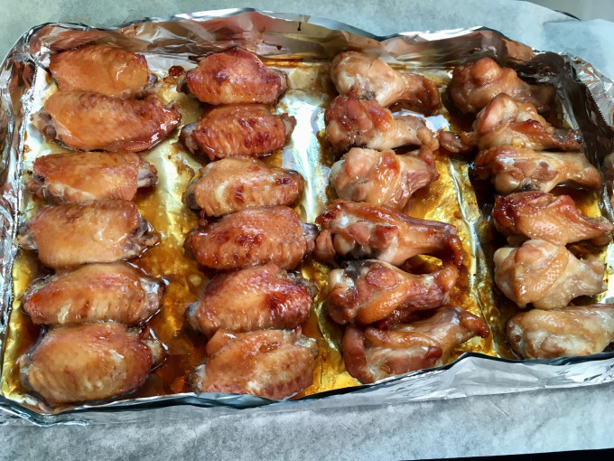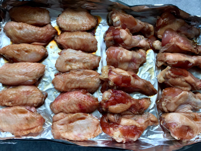 用鋁箔紙折一個盒子.醃2小時以上的雞小腿.翅.排好.烤箱上火200.下火180.預熱10分鐘.烤25分鐘.烤15分鐘後要打開看一下.醃料中有糖.怕焦可以多蓋一張鋁箔紙