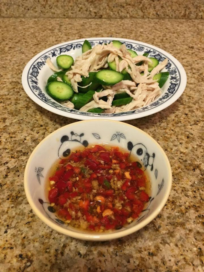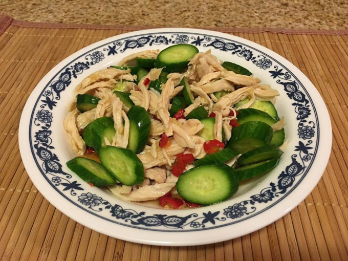 醬汁淋上雞絲和小黃瓜上面,攪拌均勻就好了!
