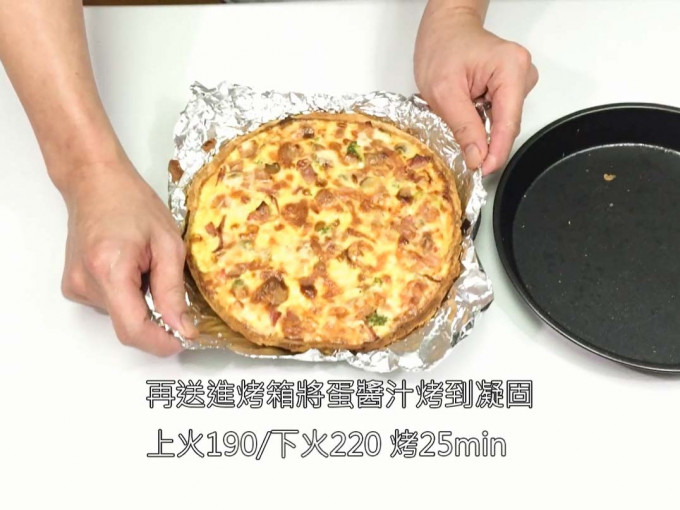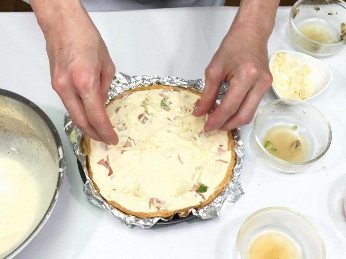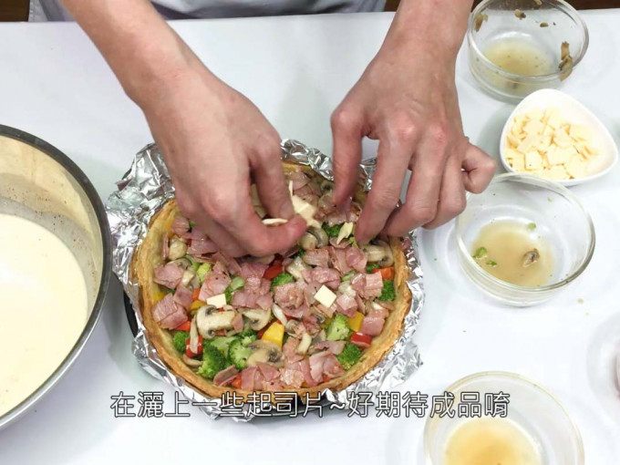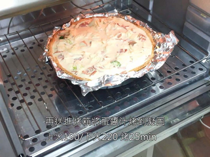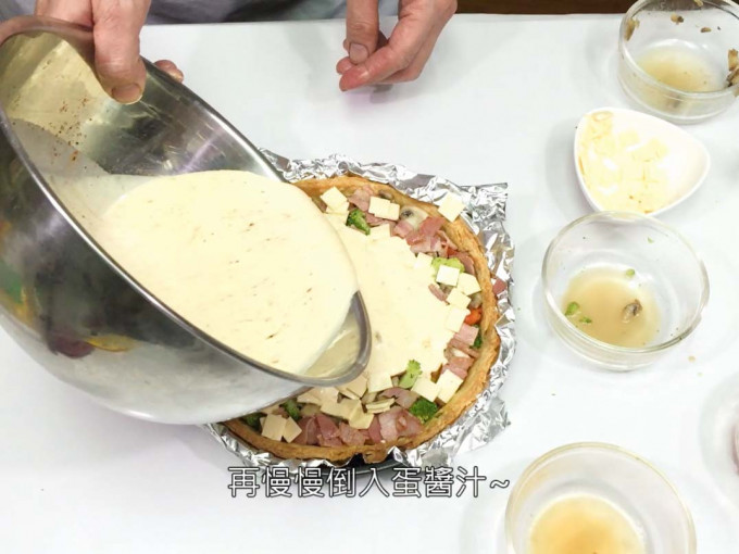 待餡料都鋪滿時,在將蛋醬汁慢慢倒入