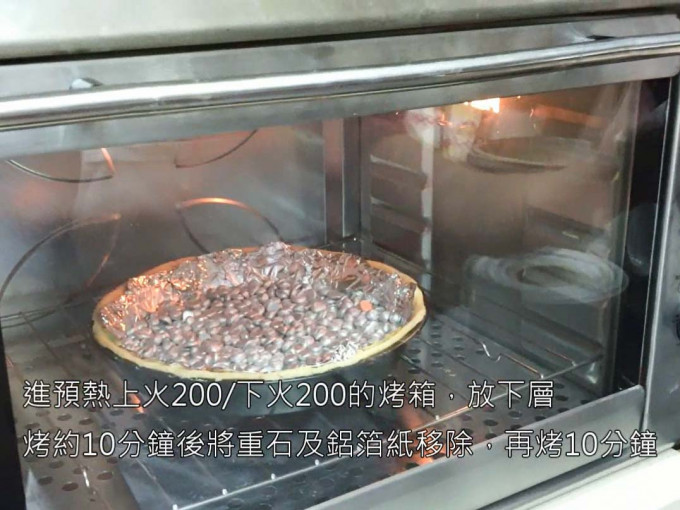 進預熱上火/下200度烤箱內,放下層烤約10分鐘後將重石及鋁箔紙移除,移除後再烤10分鐘