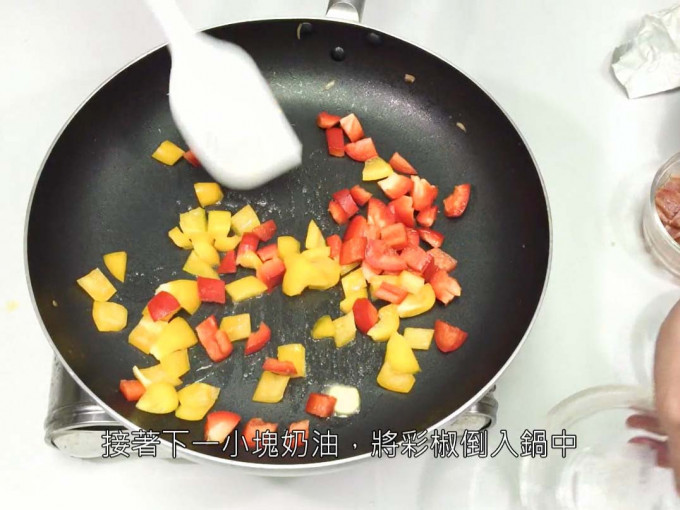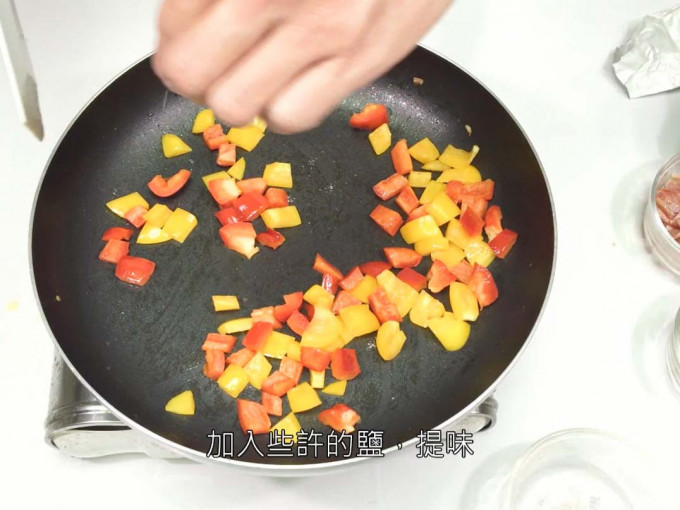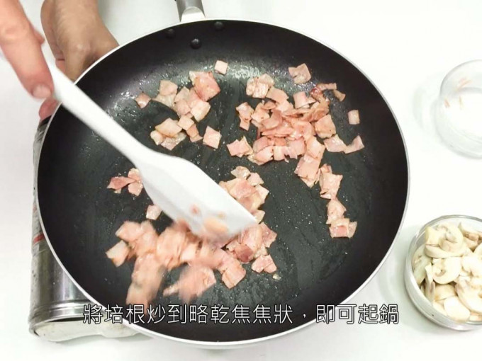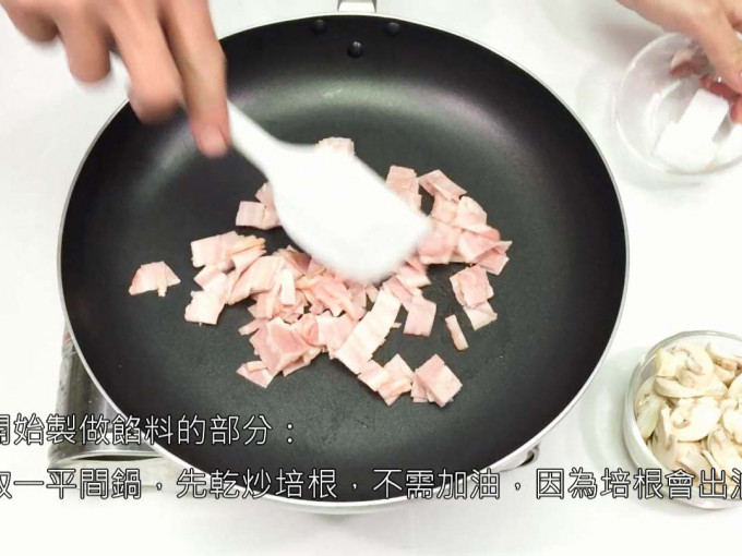起一平煎鍋,不用倒油,把切小塊的培根倒入鍋中翻炒