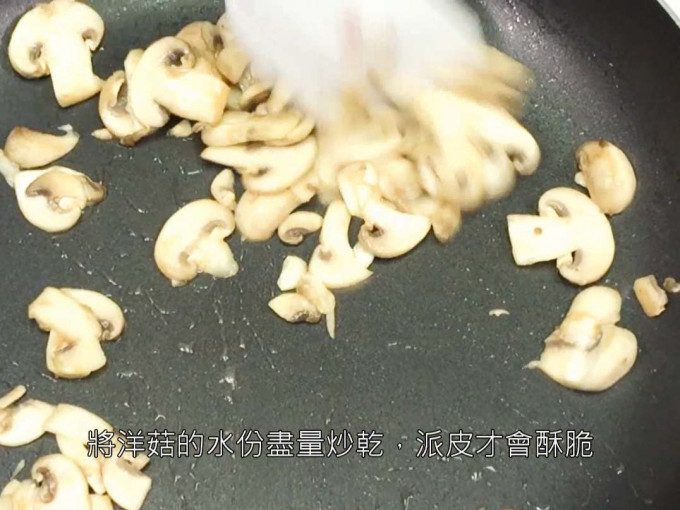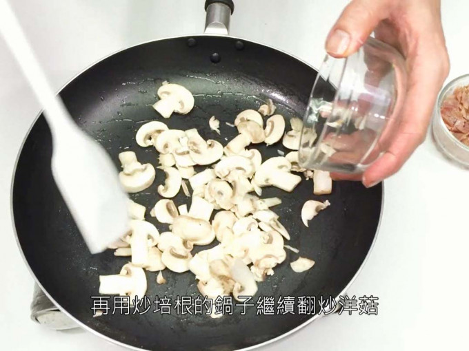 接著炒洋菇,用炒培根的鍋子直接繼續炒洋菇