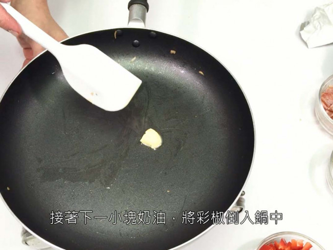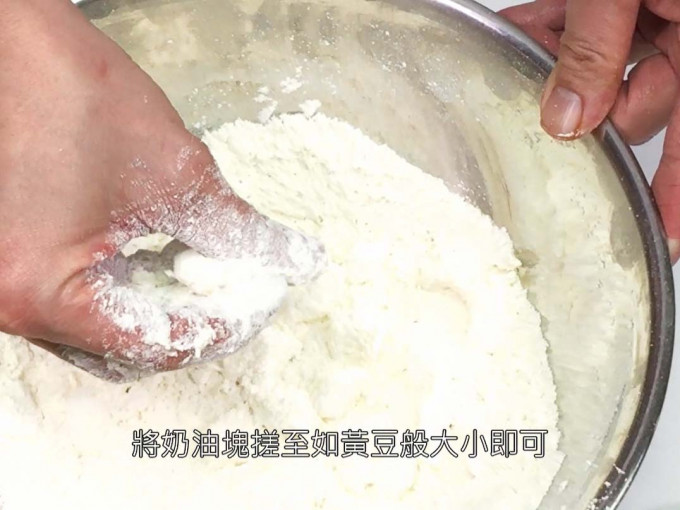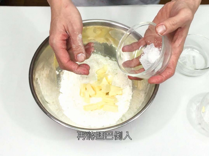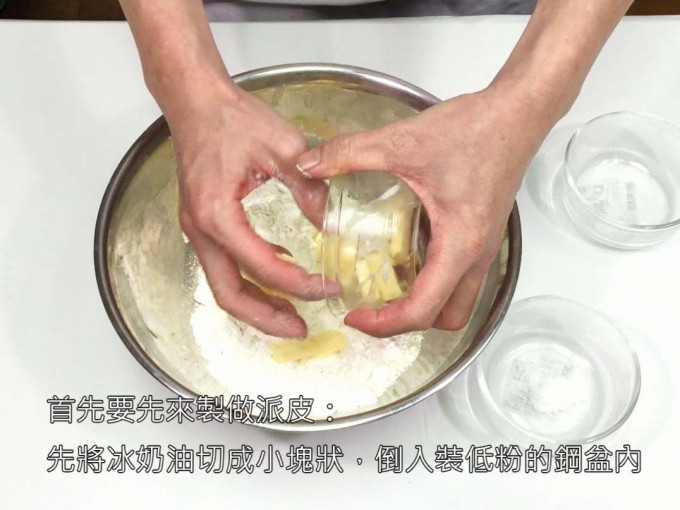 先將冰奶油切成小塊,並倒入裝低粉的鋼盆內